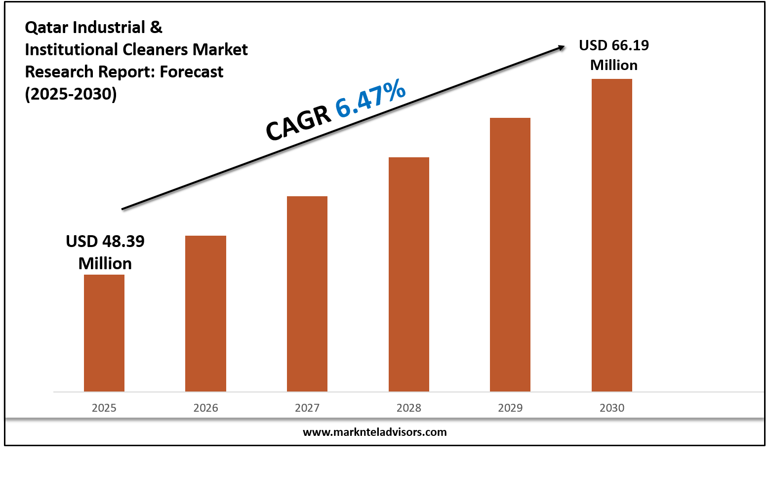 The Qatar Industrial & Institutional Cleaners Market is on an upward trajectory, currently valued at USD 48.39 million in 2025 and projected to reach USD 66.19 million by 2030, reflecting a robust compound annual growth rate (CAGR) of 6.47%. This growth is primarily fueled by increasing waste generation from various sectors including petrochemicals, oil & gas, and the healthcare industry. The government of Qatar is actively promoting cleanliness standards, and the rising demand for eco-friendly cleaning solutions is also contributing to market expansion.