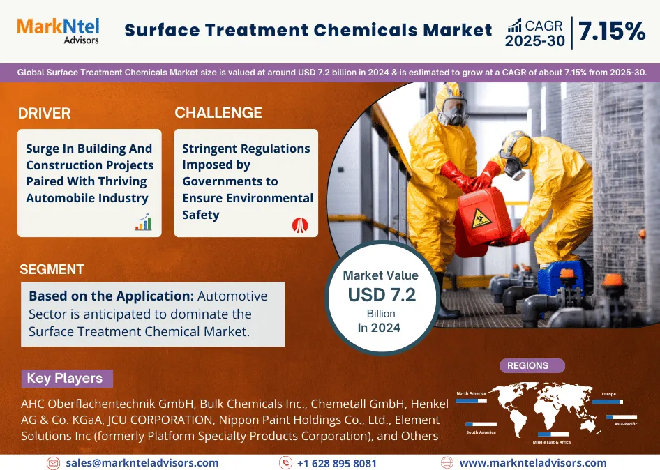 As per MarkNtel Advisors the Surface Treatment Chemicals Market size is valued at around USD 7.2 billion in 2024 and is estimated to grow at a CAGR of about 7.15% during the forecast period, i.e., 2025-30.