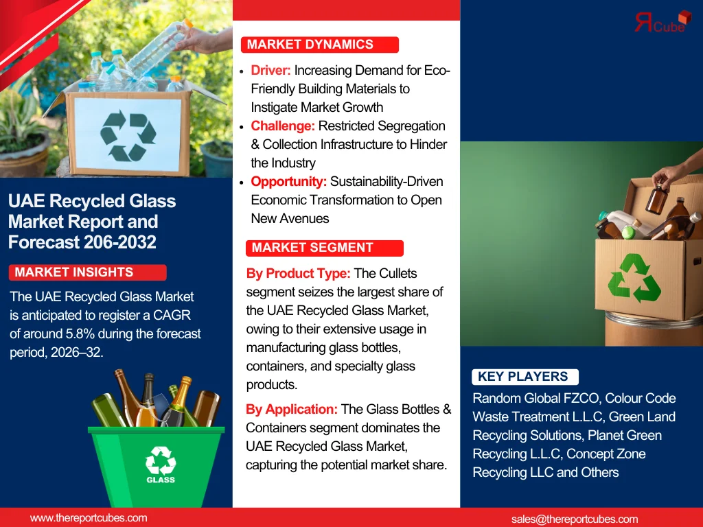 According to the latest report by The Reports Cube insights The UAE Recycled Glass Market is anticipated to register a CAGR of around 5.8% during the forecast period, 2026–32. The national market is driven by rising environmental consciousness, expanding infrastructure development, and the country's commitment to a sustainability-driven economic revolution. The UAE’s Green Agenda 2030 & Clean Energy Strategy 2050 are fundamental in encouraging eco-friendly building materials like recycled glass, mainly in construction & packaging applications.