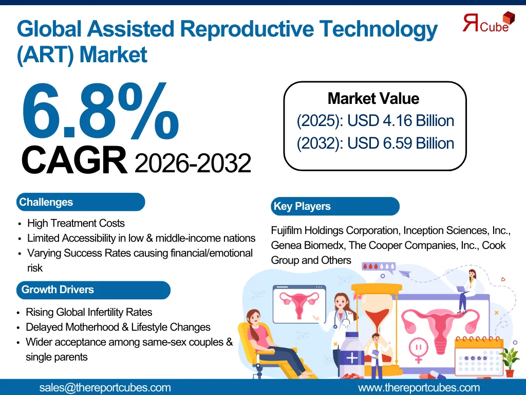 According to the latest report by The Reports Cube insights The Global Assisted Reproductive Technology Market is anticipated to register a CAGR of around 6.8% during the forecast period, 2026-32. Additionally, the market size was valued at nearly USD 4.16 billion in 2025 and is projected to reach almost USD 6.59 billion by 2032.