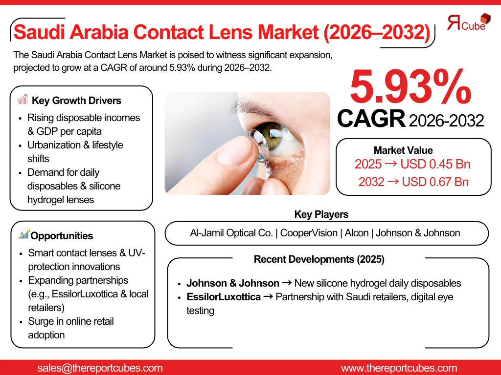 According to the latest report by The Reports Cube insights The Saudi Arabia Contact Lens Market is poised to witness significant expansion, projected to grow at a CAGR of around 5.93% during 2026–2032. The market size, valued at nearly USD 0.45 billion in 2025, is expected to reach close to USD 0.67 billion by 2032. The market growth is supported by increasing customer preference for advanced eye care solutions & vision correction products.