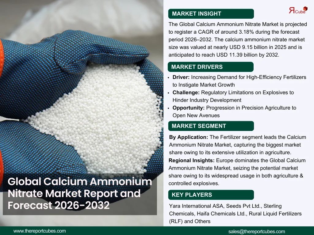 According to the latest report by The Reports Cube insights The Global Calcium Ammonium Nitrate Market is projected to register a CAGR of around 3.18% during the forecast period 2026–2032. The calcium ammonium nitrate market size was valued at nearly USD 9.15 billion in 2025 and is anticipated to reach USD 11.39 billion by 2032