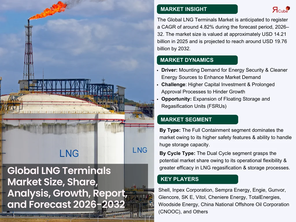 According to the latest report by The Report Cube, study LNG Terminals Market is anticipated to register a CAGR of around 4.82% during the forecast period, 2026–32. The market size is valued at approximately USD 14.21 billion in 2025 and is projected to reach around USD 19.76 billion by 2032. The increasing demand for clean energy sources & the transition toward decarbonization are driving growth in the liquefied natural gas (LNG) sector. LNG terminals, essential for LNG import & LNG export, are observing heightened investment, specifically in regions underlining energy security & diversification of energy supply chains.