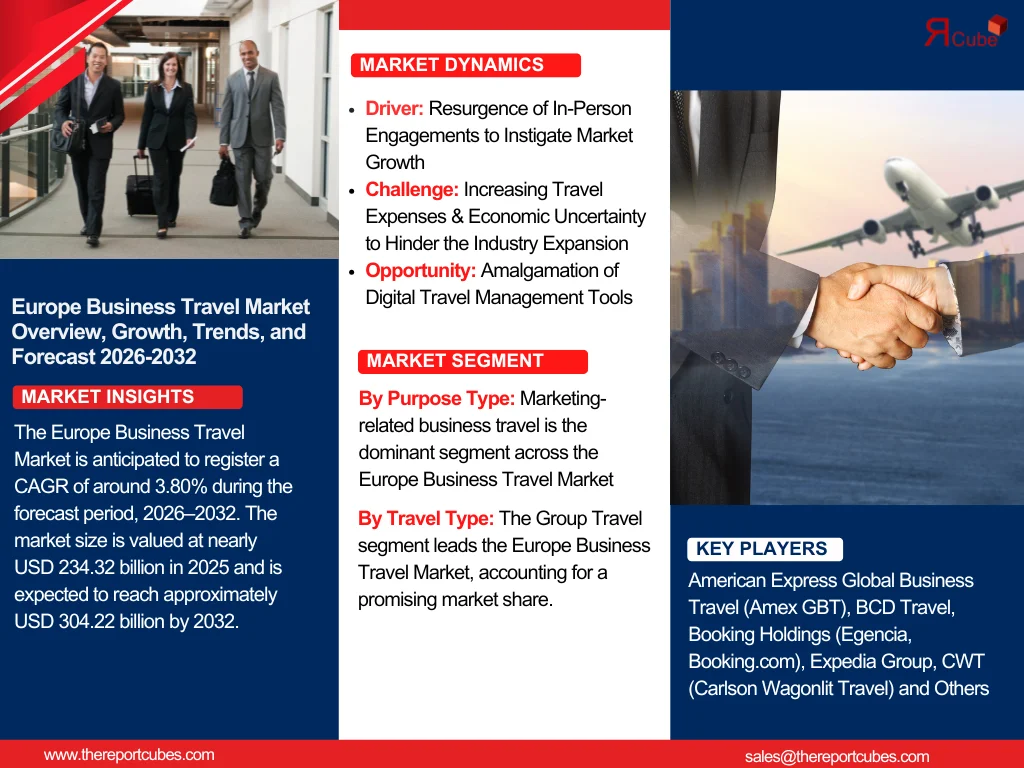 According to the latest report by The Report Cube, study Europe Business Travel Market is anticipated to register a CAGR of around 3.80% during the forecast period, 2026–2032. The market size is valued at nearly USD 234.32 billion in 2025 and is expected to reach approximately USD 304.22 billion by 2032. The country remains a prominent hub for corporate mobility due to its globalized economy, cutting-edge infrastructure, and solid business network. Additionally, the surge in corporate globalization, the rise in international trade relations, and the resurgence of in-person business events are major factors motivating industry expansion.