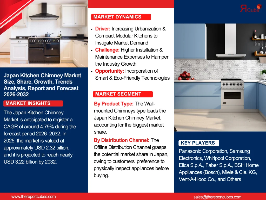 According to the latest report by The Report Cube, study Japan Kitchen Chimney Market is anticipated to register a CAGR of around 4.79% during the forecast period 2026–2032. In 2025, the market is valued at approximately USD 2.32 billion, and it is projected to reach nearly USD 3.22 billion by 2032. The development in this market is being instigated by mounting awareness of indoor air quality, shifting customer lifestyles, increasing urbanization, and the growing acceptance of modular kitchens in urban households in Japan.