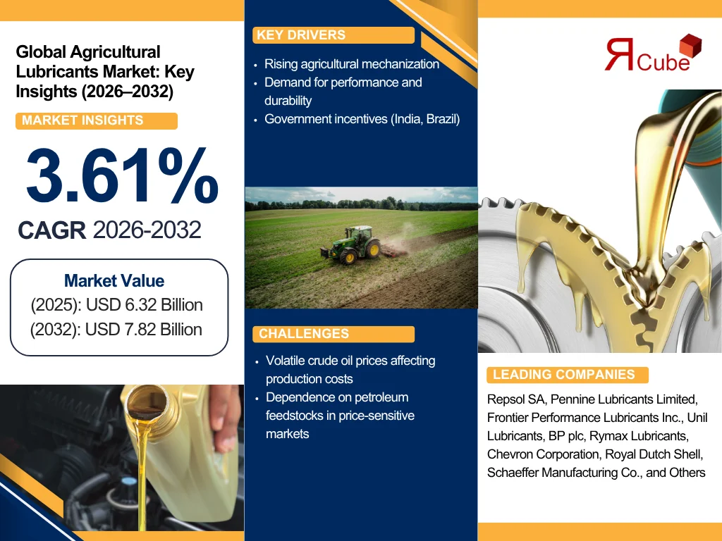 According to the latest report by The Report Cube, study Agricultural Lubricants Market is anticipated to register a CAGR of around 3.61% during the forecast period, 2026–2032. The market is valued at approximately USD 6.32 billion in 2025 and is projected to reach nearly USD 7.82 billion by 2032. This industry is undergoing noteworthy growth owing to the rising mechanization of agriculture, which motivates the demand for high-performance lubricants custom-made for agricultural equipment. As machinery, including harvesters, tractors, and other farm machinery, becomes more sophisticated, the necessity for advanced lubricants, specifically those that can withstand extreme operating conditions, has increased radically.